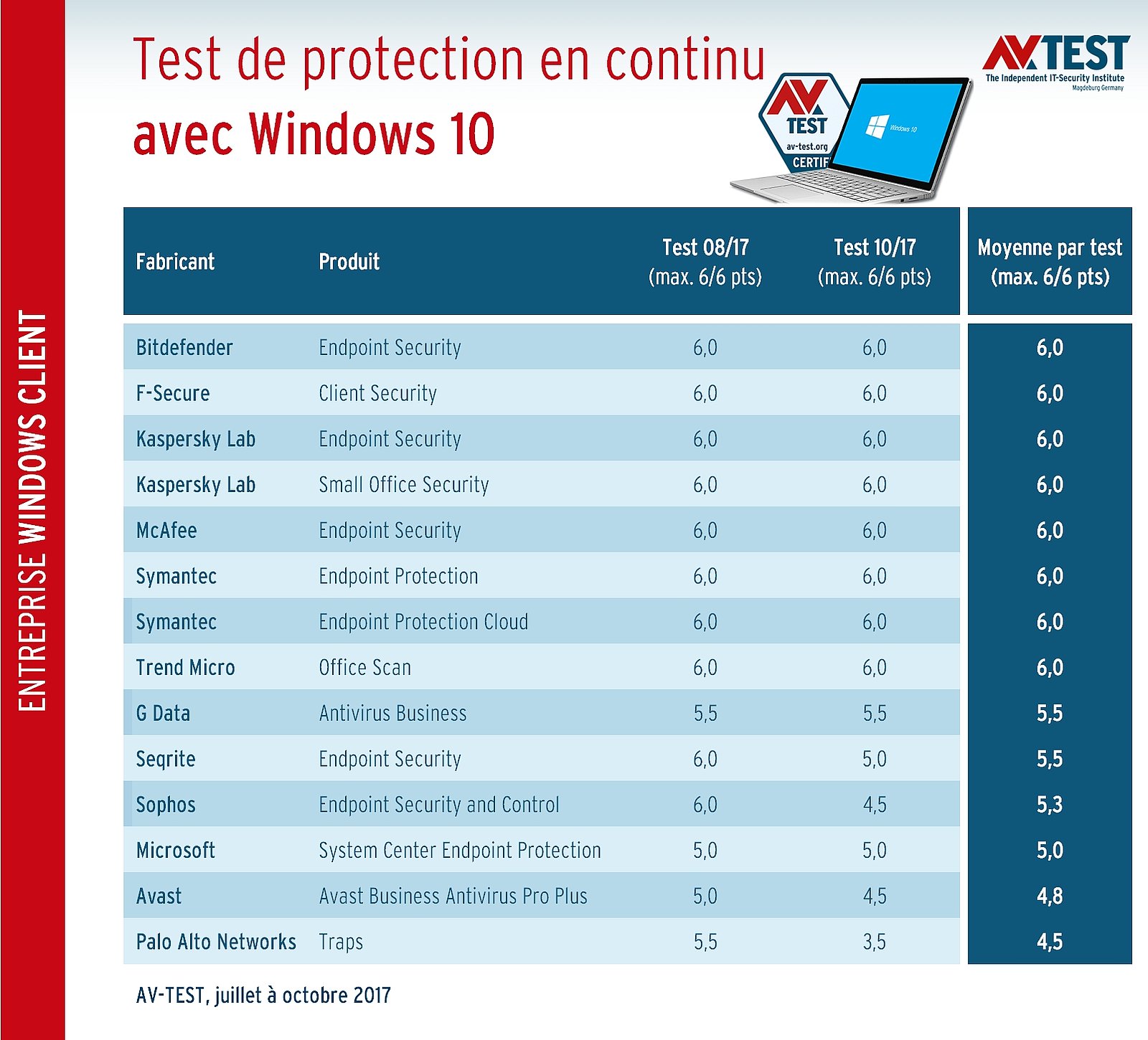 Le test incluait les suites de sécurité pour entreprises d’Avast, Bitdefender, F-Secure, G Data, Kaspersky Lab (Endpoint et Small Office Security), McAfee, Microsoft, Palo Alto Networks, Seqrite, Sophos, Symantec (Endpoint Protection et Endpoint Protection Cloud) et Trend Micro. Les essais se sont déroulés de juillet à octobre 2017. Chaque produit a été soumis mensuellement à une série de tests complète avec un test en conditions réelles (real-world test) et un test avec le kit de référence d’AV-TEST. Ces kits comprenaient en tout 400 nouveaux programmes malveillants encore inconnus et 20 590 exemplaires de malwares déjà connus.
