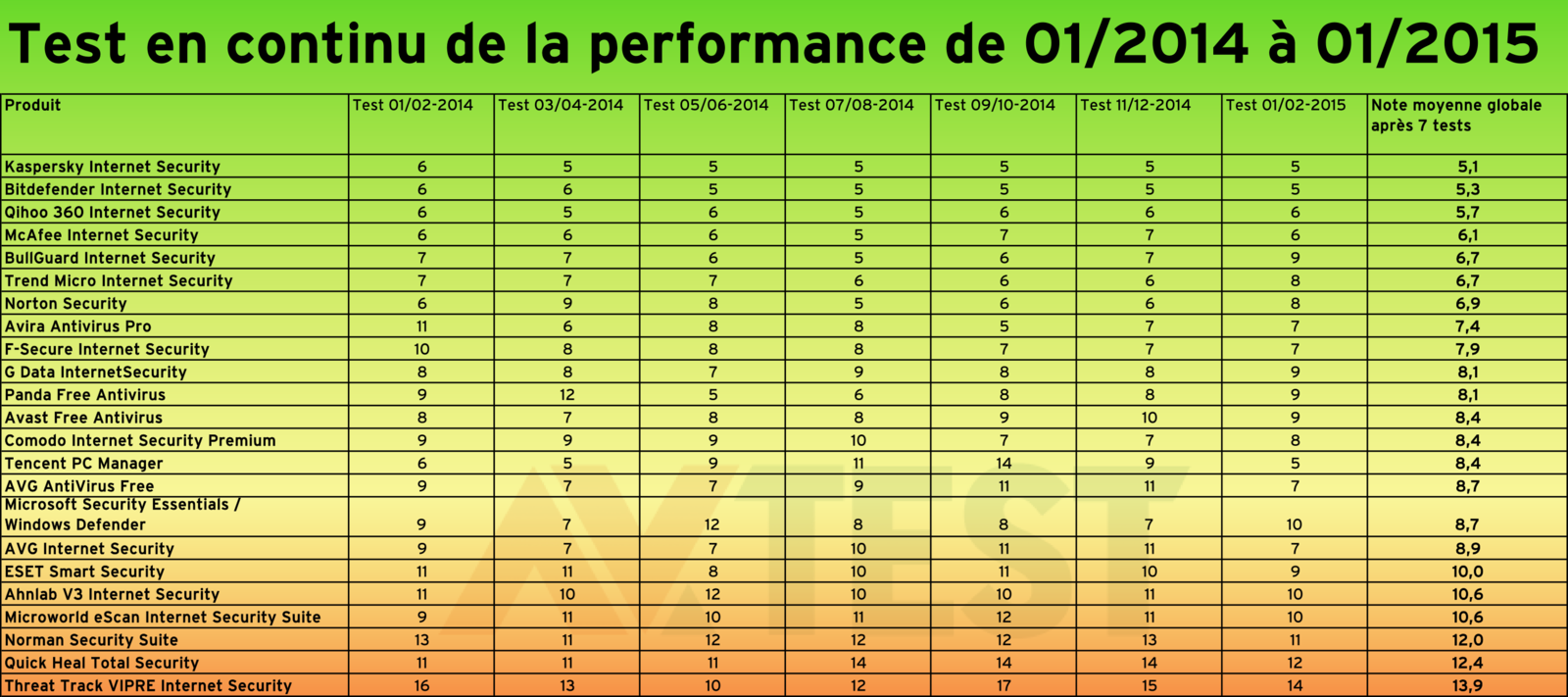 Le résultat montre qu'un bon logiciel de protection ne freine pas considérablement un ordinateur Windows. Comme pour tous les logiciels en cours d'exécution, les antivirus nécessitent quelques ressources du système ce qui ralentit par principe l'ordinateur. Les produits de Kaspersky, Bitdefender et Qihoo 360 ont fait preuve de la plus faible influence sur le système durant ce test continu, et ce, tout en offrant une bonne protection comme le prouvent les derniers tests de protection (« Les meilleurs logiciels antivirus pour Windows - Particuliers »).