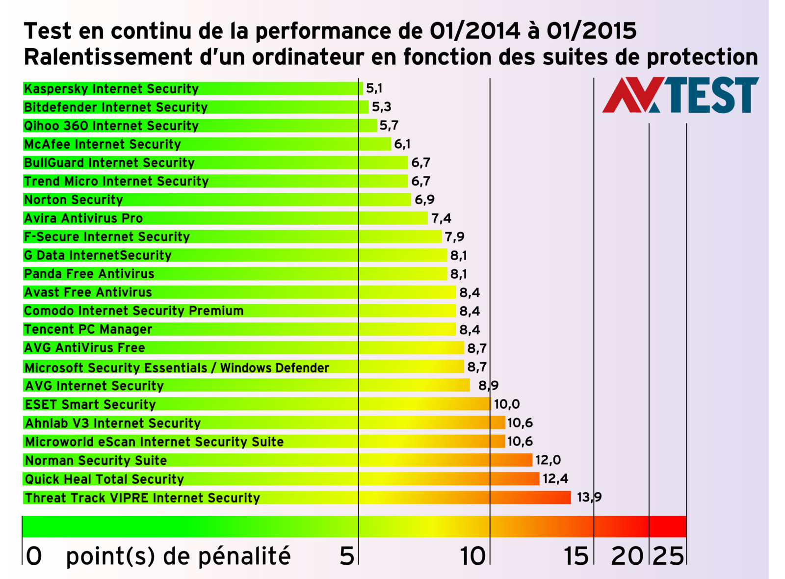 Pour tous les segments du test, 1 à 5 points de pénalité ont été attribués après chaque test (1 point étant le meilleur résultat et 5 points le pire). Si un logiciel antivirus ralentit un système entre 0 et 20 %, alors il obtient un point de pénalité. Il obtient deux points pour une perte de performance entre 21 et 40 %, trois points entre 41 et 60 % et ainsi de suite jusqu'à 5 points.