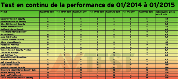 Le lecteur d'un test en continu ne voit que la note globale attribuée pour l'évaluation de la vitesse ou de la performance d'un produit. Mais pour arriver à cette note, le testeur doit parcourir un long chemin. Il doit pour cela surveiller une solution pendant 14 mois à travers 7 séries d'essais. Pour chaque produit, 19 000 résultats individuels ont été additionnés afin d'obtenir 35 résultats de catégories de test. Ce n'est qu'après ce long processus que l'on parvient à la note d'un seul produit. Dans le test en continu actuel de janvier 2014 à fin février 2014, pas moins de 23 produits ont été évalués quant à leur vitesse dans le laboratoire d'AV-TEST. Les systèmes d'exploitation Windows XP, 7 et 8.1 ont été utilisés en alternance à cet effet.