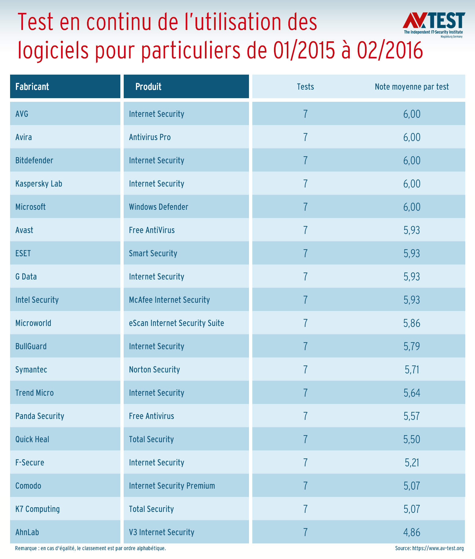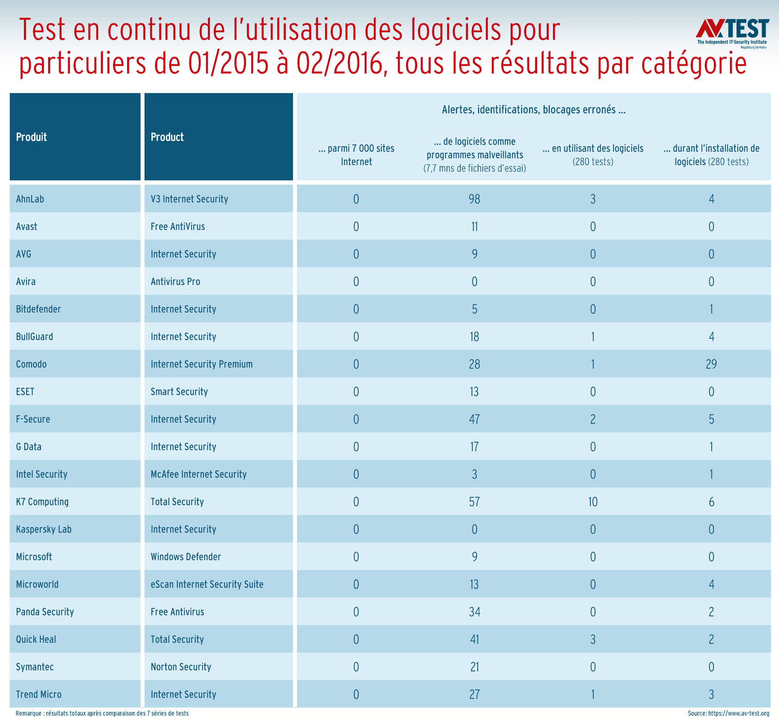 Environ 7 000 sites Internet ont été consultés et 7,7 millions de fichiers ont été testés pour chaque solution durant un délai de 14 mois. De plus, 280 applications ont été exécutées à deux reprises et les testeurs ont noté si le logiciel a déclenché une fausse alerte ou s’il a même bloqué l’application.
