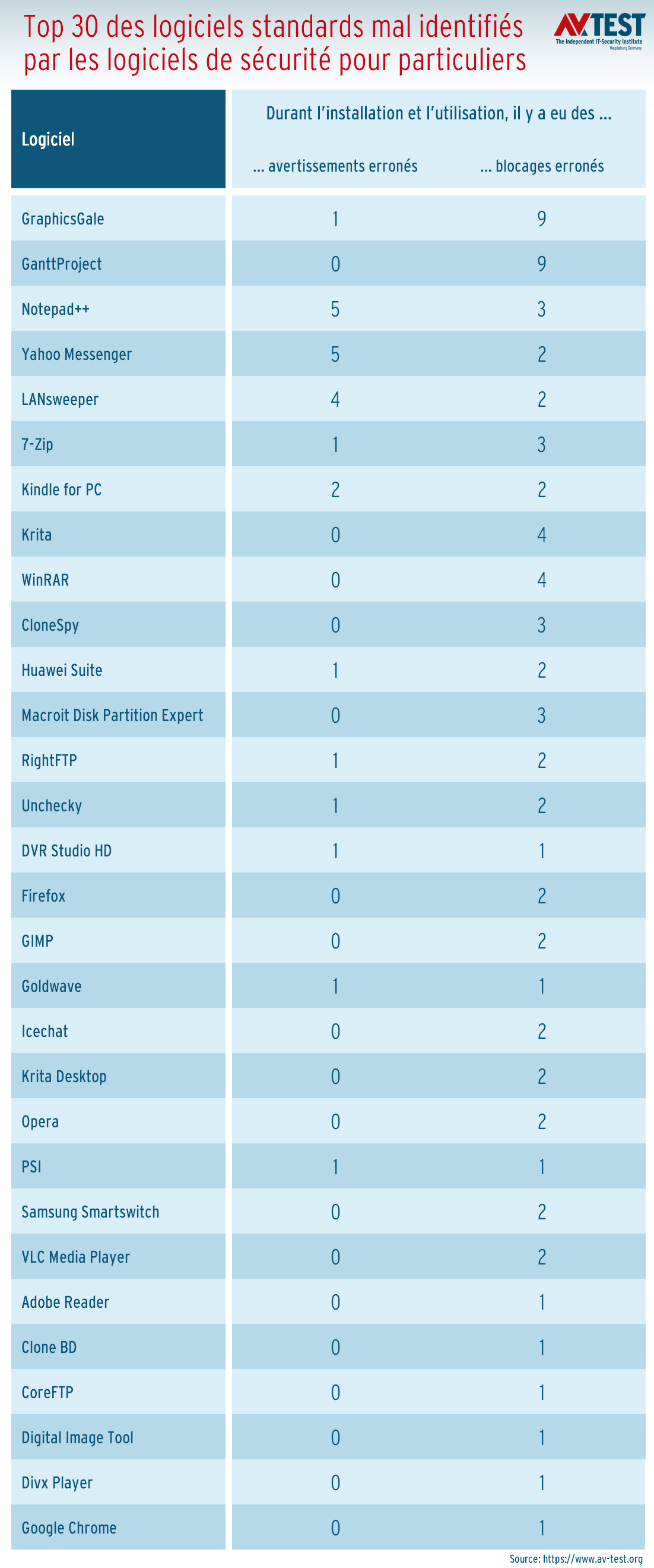 Certains fabricants vont se mordre les doigts lorsqu’ils verront quels programmes sont responsables des alertes erronées. Nous avons rassemblé ces derniers dans les tableaux Top 15 et Top 30. Il s’agit de programmes connus comme Notepad++, Yahoo Messenger ou WinRAR. Ce ne sont pas des raretés mais des logiciels standards qu’il faut connaître. Étant donné la faible quantité de faux positifs, les fabricants devraient rapidement venir à bout de ces soucis dans les prochaines versions des solutions.