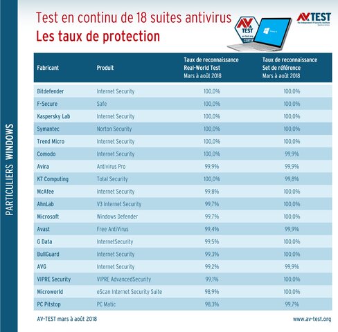 Durant l'analyse, les produits pouvaient remporter jusqu'à 6 points dans chaque catégorie testée. Seule la suite Avira Antivirus Pro a atteint les 18 points lors du test en continu qui s'est déroulé de mars à août 2018. Les produits de Kaspersky Lab, McAfee, AhnLab, Bitdefender et VIPRE Security la suivent toutefois de près avec des notes de 17,8 à 17,5 points. Dans un test de certification classique d'AV-TEST, ils se verraient attribuer en plus du certificat de sécurité la mention PRODUIT D'EXCELLENCE (TOP PRODUCT). Le laboratoire la décerne à tous les produits qui ont obtenu un résultat total de 18 à 17,5 points.