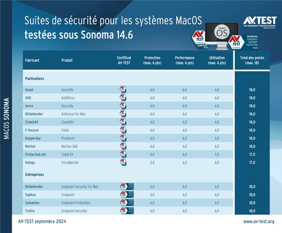 La hausse constante des menaces dans le domaine de la sécurité informatique ne concerne pas uniquement les systèmes Windows, Linux ou le cloud. Les systèmes MacOS sont aussi les cibles de nombreuses attaques. Un logiciel de protection efficace pour Mac est donc à recommander d’urgence à chaque utilisateur et à chaque entreprise. Le test actuel au cours duquel 10 produits pour utilisateurs particuliers et 4 solutions pour entreprises ont été mis au banc d’essai permet de savoir lesquels ont fait leurs preuves. Le test du 3e trimestre a été réalisé par le laboratoire d’AV-TEST de juillet à septembre 2024 sous MacOS Sonoma 14.6. Les résultats donnent une image claire des capacités des produits dans les différentes catégories protection, performance et utilisation. Un produit peut récolter jusqu’à 6 points dans chaque section du test. Le score maximal s’élève donc à 18 points. Lors de ce test, la majorité des produits a même atteint l’objectif.