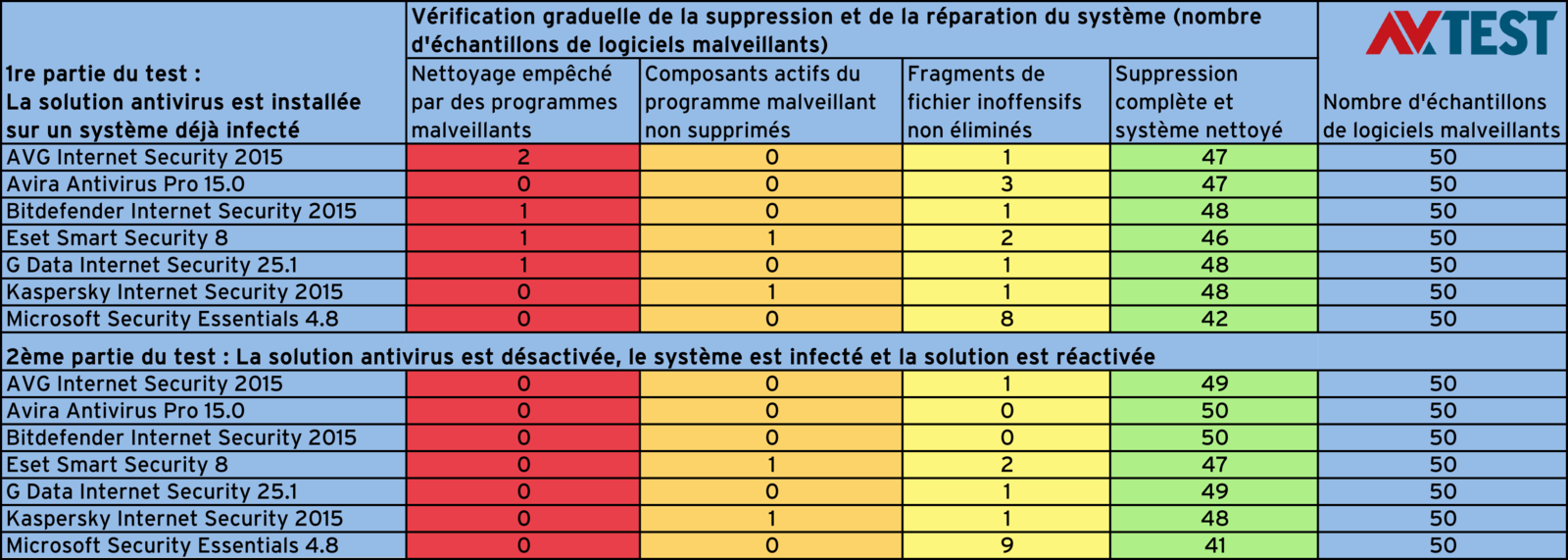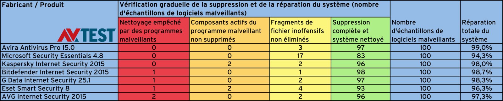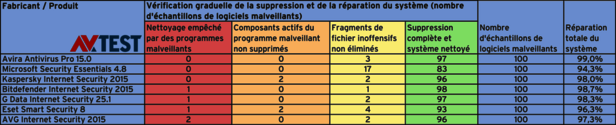Durant toute la durée de l'essai, différentes familles de logiciels malveillants ont régulièrement été testées puisque ces dernières se développent sans cesse. Les échantillons de logiciels malveillants utilisés étaient connus de toutes les solutions à chacun des moments du test et devaient par conséquent être identifiés. Dans les tableaux du test, la qualité du nettoyage et de la réparation a été évaluée selon les critères suivants :