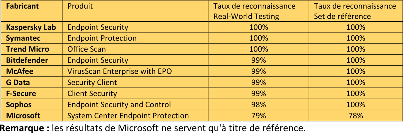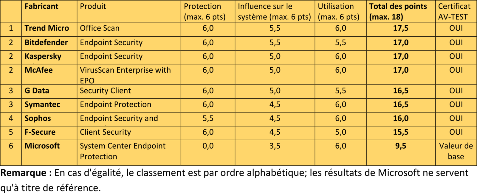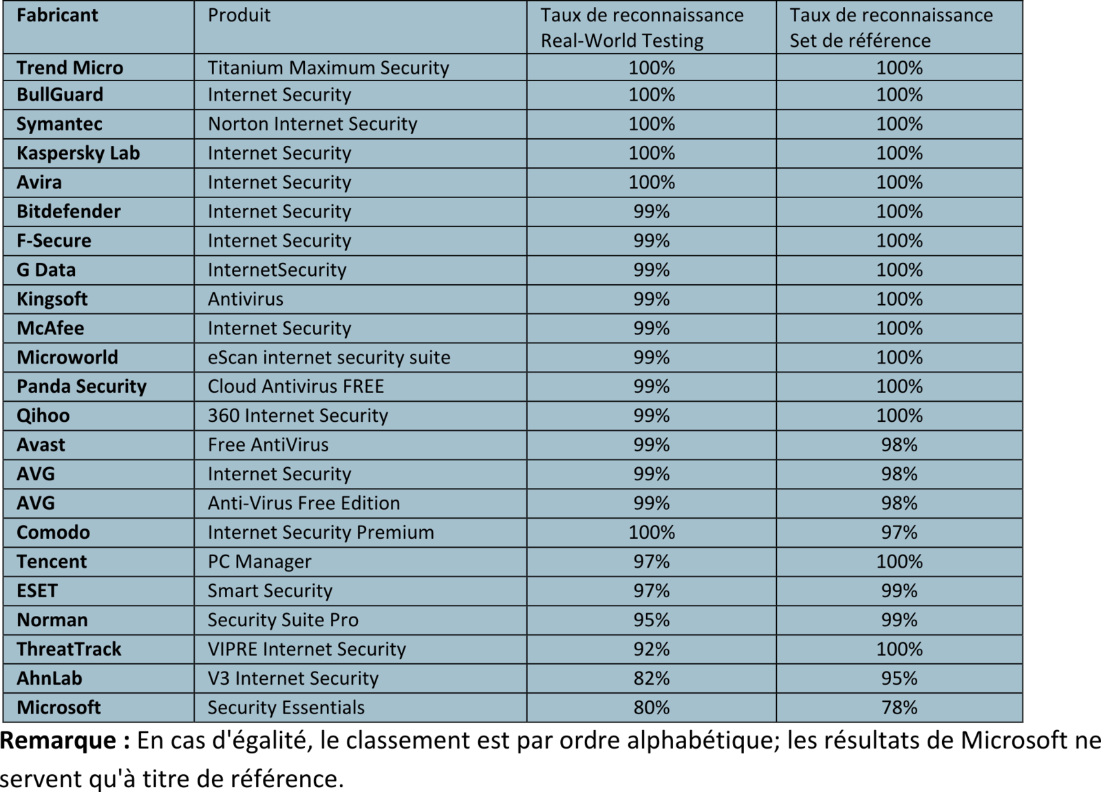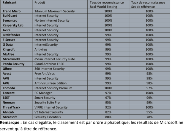Toutes les solutions, que ce soit pour le secteur privé ou professionnel, ont obtenu de bons résultats lors de ces tests, lesquels leur ont valu des notes entre 5 et 6/6. Seul le produit de Comodo ne mérite que 4/6.