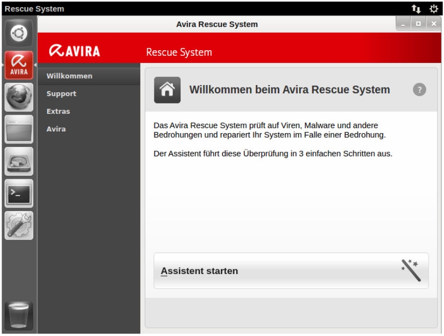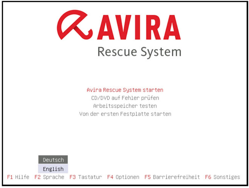 Les étapes suivantes s'effectuent presque automatiquement. Les CD de récupération scannent l'ordinateur complet à la recherche de programmes malveillants et les suppriment du système. Avec Avira, vous appuyez sur « F2 » pour choisir la langue puis vous lancez le Rescue System. Une fois que le système est chargé, un assistant vous aide à effectuer toutes les étapes suivantes.
