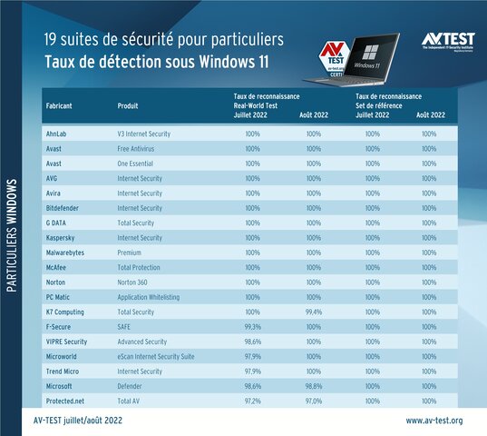 Lors d’un premier test réalisé sur Windows 11, le laboratoire d’AV-TEST a soumis tous les nouveaux produits Windows 11 des fabricants à un examen approfondi. Les suites antivirus version Windows 11 des 19 fabricants suivants ont été mises sur le banc d’essai : AhnLab, Avast (Free), Avast (One Essential), AVG, Avira, Bitdefender, F-Secure, G DATA, K7 Computing, Kaspersky, Malwarebytes, McAfee, Microworld, Norton, PC Matic, Protected.net, Trend Micro, VIPRE Security et bien sûr Microsoft.