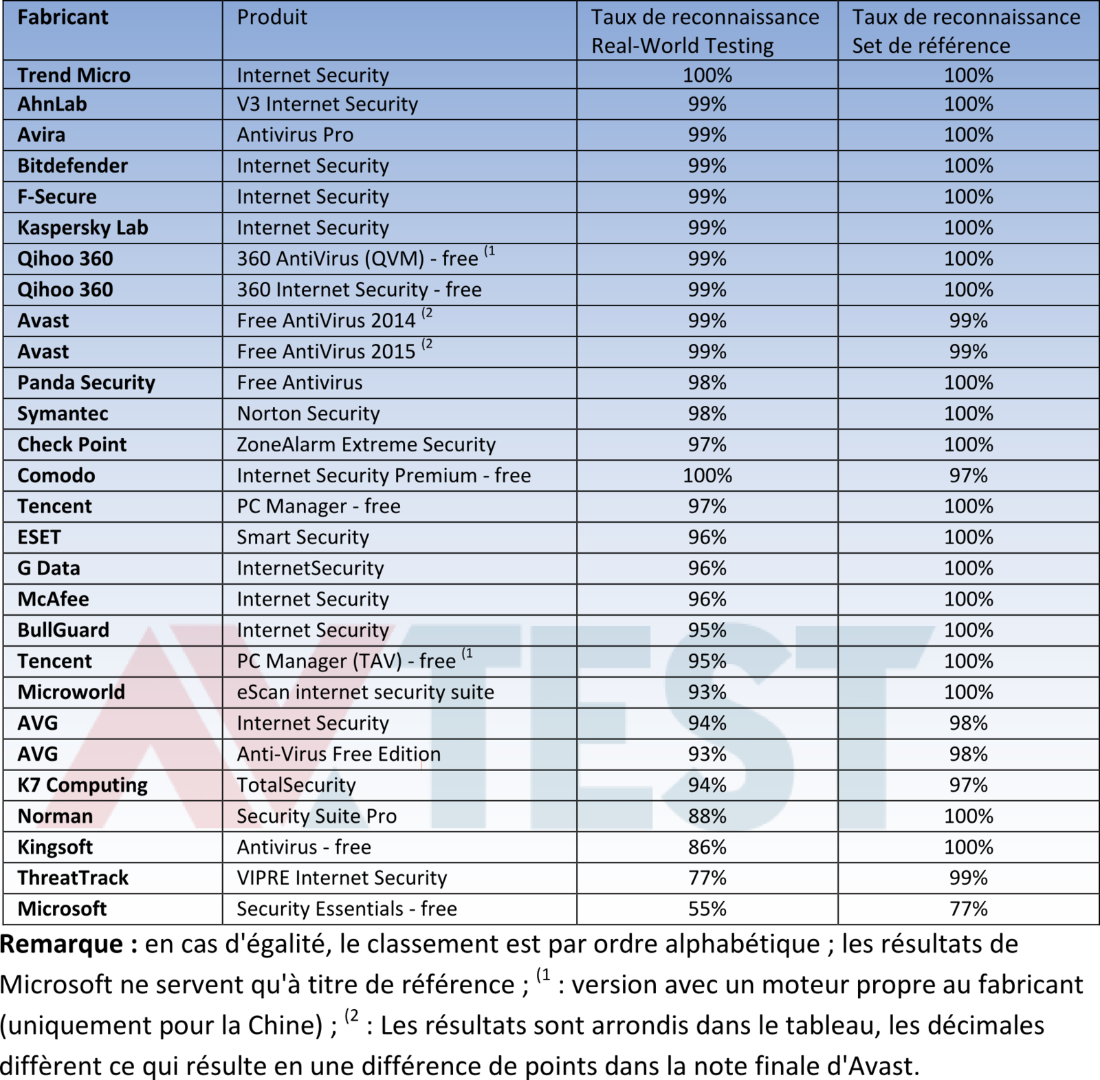 Trend Micro est le seul produit qui s'illustre en atteignant 100 % lors des deux parties du test de reconnaissance (AV-TEST, version de janvier 2015).